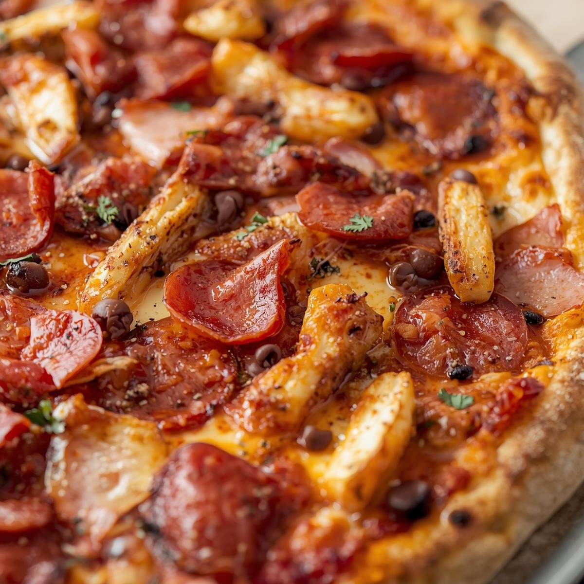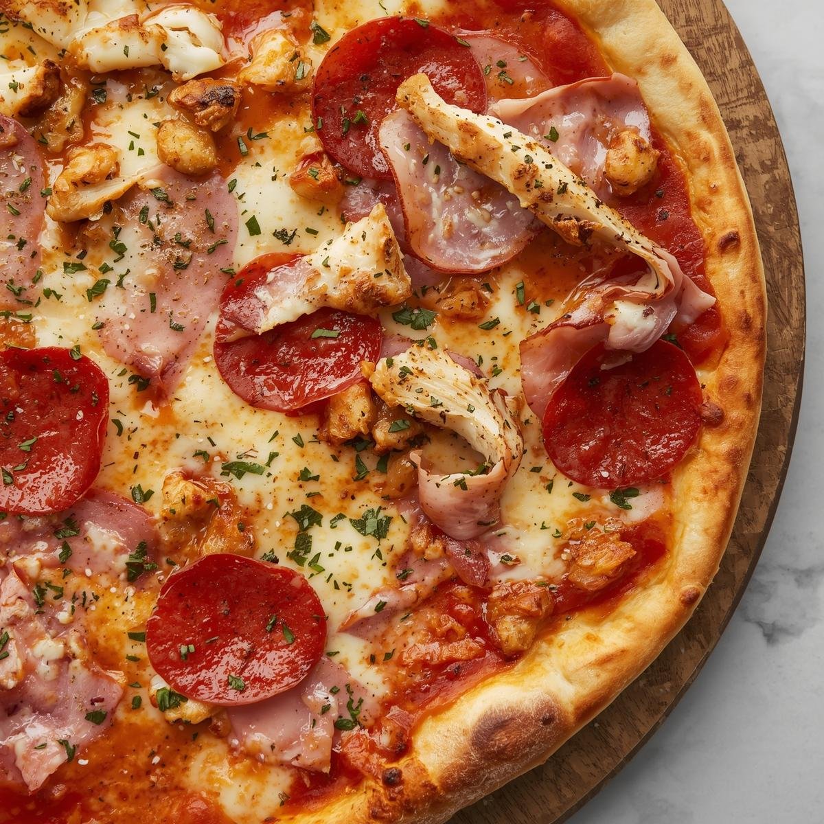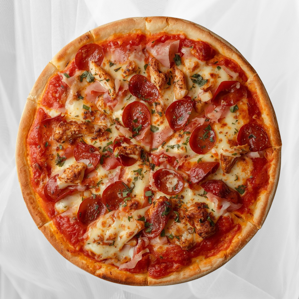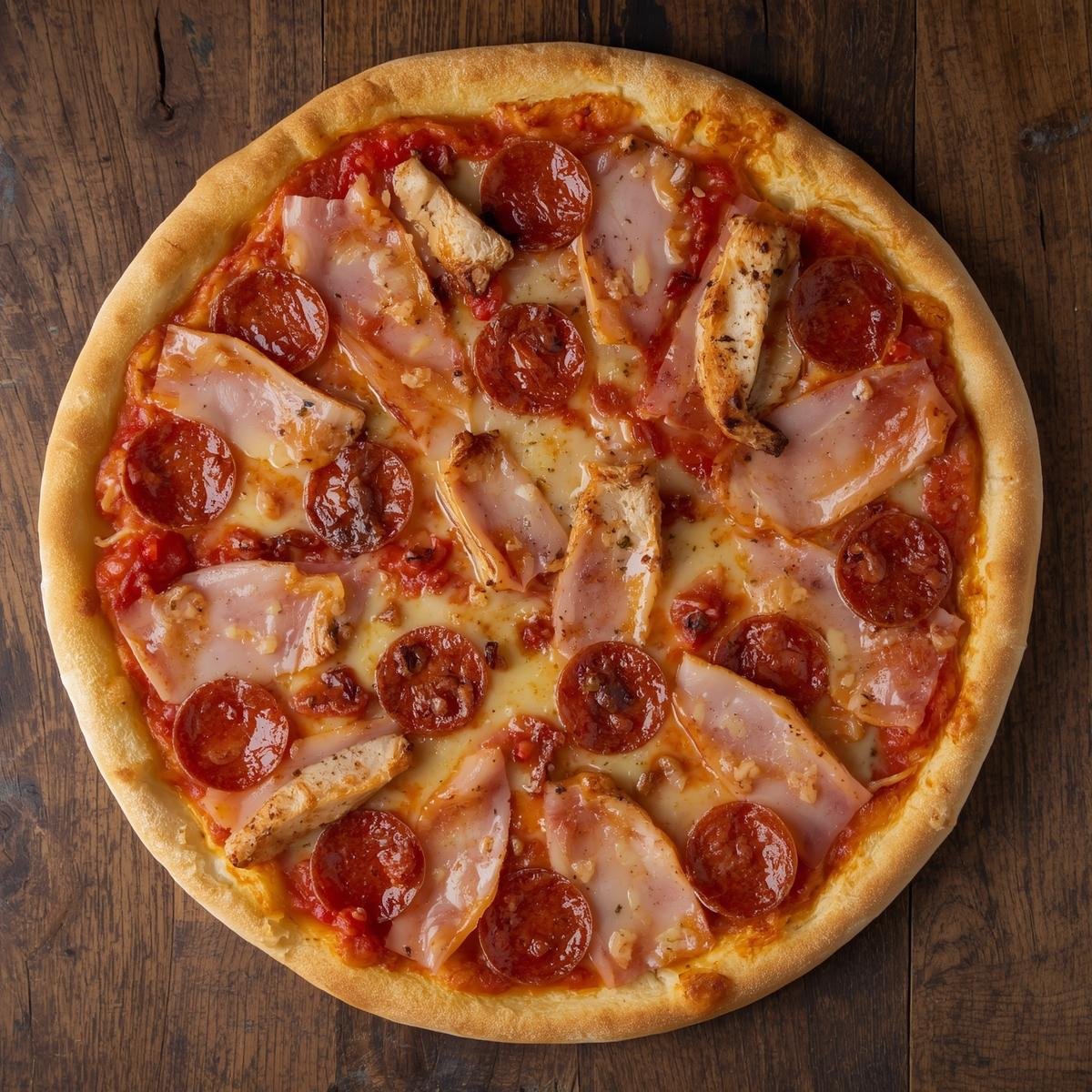 Pepperoni, Ham, Chicken, Mozzarella, tomato sauce