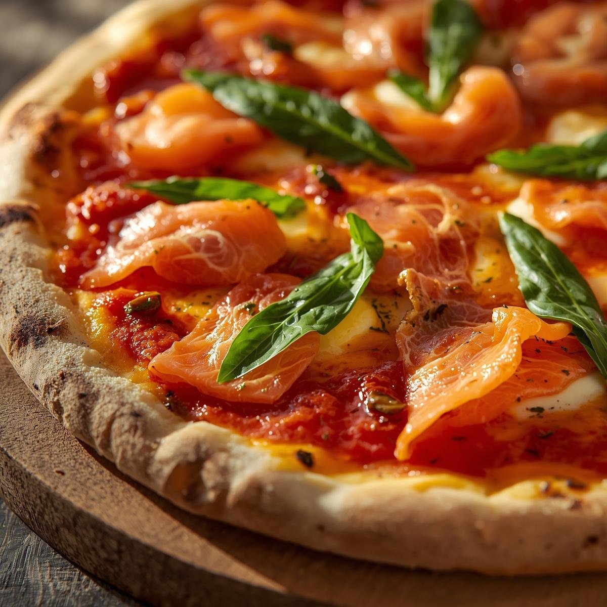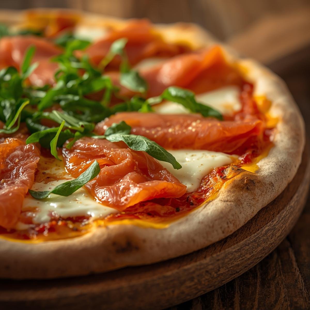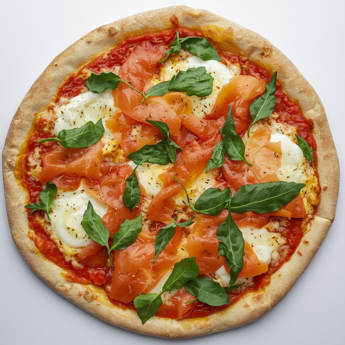 100% Italian tomato Sauce, Mozzarella, Smoked Salmon with Rocket Leaves